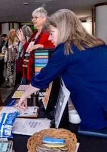 Anyway, some serious energy kicked in when I set up our table – the supplies had beaten me there, and my mentor/friend/table partner Denslow was on the way. I’ve done tons of setting up in other venues with other kinds of events, and I enjoy arranging, tweaking, and messing with the different marketing materials. Almost immediately, early-arriving colleagues stopped by to chat. The curious queued up to start asking questions. Denslow soon joined me, and we were off to the races.